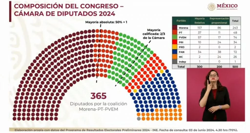 De acuerdo con la información del Programa de Resultados Electorales Preliminares (PREP) del Instituto Nacional Electoral (INE), tras la elección de este 2 de junio, la Cámara de Diputados tendrá una mayoría legislativa calificada de Morena.