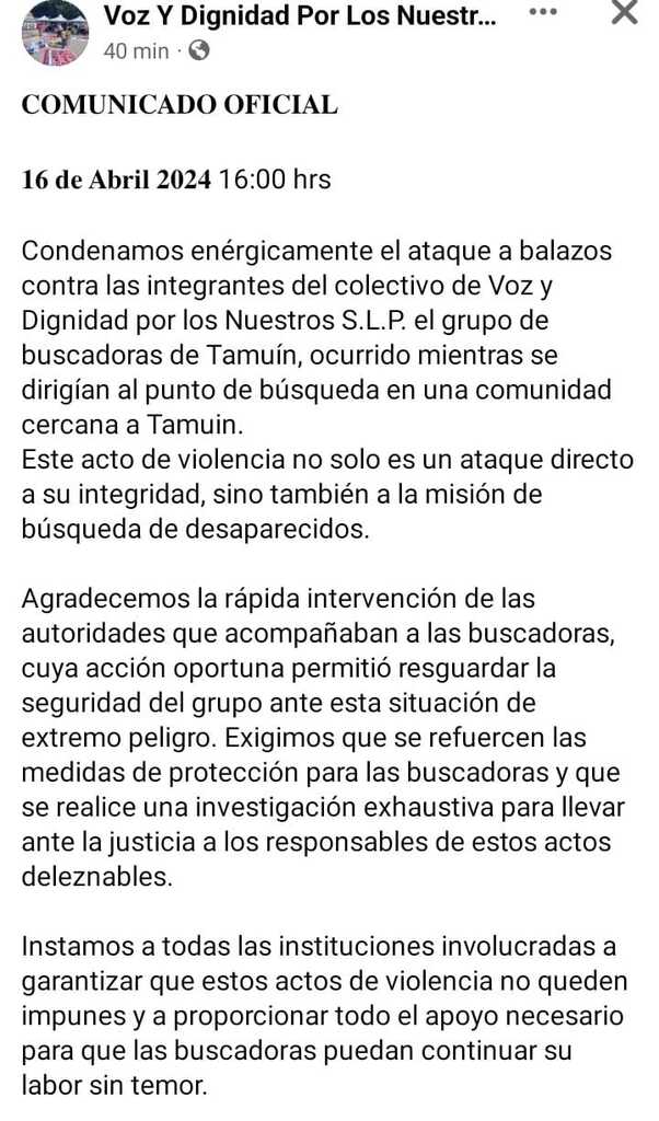 A través de sus redes sociales, el colectivo Voz y Dignidad por los Nuestros, confirmó un ataque armado en contra de sus integrantes en el municipio de Tamuín la tarde de este martes.