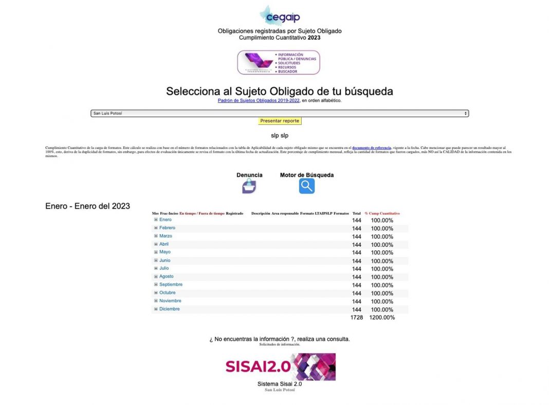 La Unidad de Transparencia del Ayuntamiento de la capital potosina informó que en los 29 meses concluidos de esta administración, la Comisión Estatal de Garantía de Acceso a la Información Pública (CEGAIP) reporta el cien por ciento del cumplimiento cuantitativo en las obligaciones.