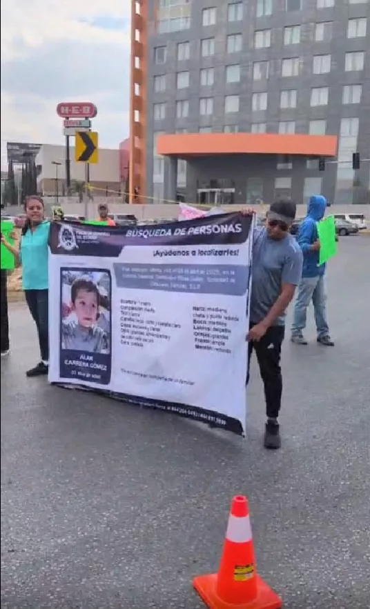 San Luis Potosí, SLP.– La desesperación crece. Familiares del pequeño Alan Carrera Gómez bloquearon la glorieta Real Inn, en la salida hacia la carretera a Guadalajara, para exigir que se intensifique su búsqueda, denunciando además que la Fiscalía no ha dado respuesta clara ni avances contundentes en el caso.