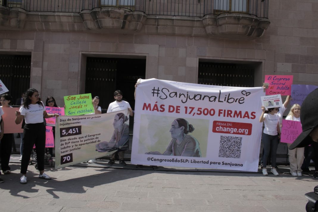 Al interior del recinto del Poder Legislativo, la familia, amigos y activistas recapitularon el caso de Sanjuana, originaria de la comunidad Charco Cercado cerca del municipio de Matehuala, en donde comenzó sus estudios y una relación con un hombre 15 años mayor, el cual la manipuló y engañó para involucrarla en el delito de secuestro, sin que ella estuviera enterada.