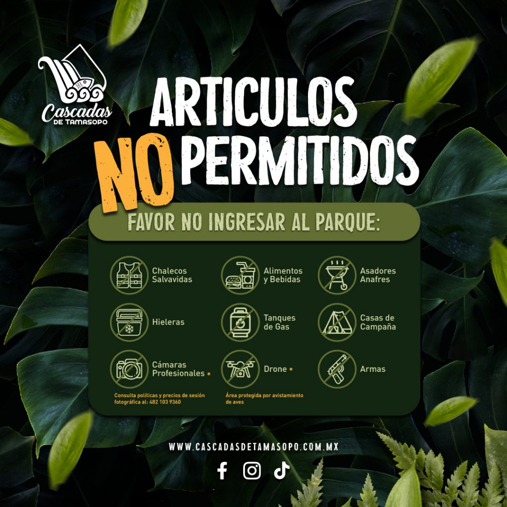 En la publicación de la página de Cascadas de Tamasopo se explica que no se permite el ingreso con chalecos salvavidas, alimentos ni bebidas, cámaras fotográficas profesionales, drones, asadores, hieleras, casas de campaña, entre otros objetos.