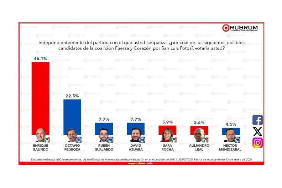 En la encuesta realizada, a la pregunta: “Independientemente del partido con el usted simpatice, ¿cuál de los siguientes posibles candidatos de la Coalición Fuerza y Corazón por San Luis Potosí votaría usted?”, Galindo Ceballos obtuvo el 46.1% de apoyo; Octavio Pedroza Gaitán el 22.5%; y el diputado local Rubén Guajardo Barrera el 7.7%; empatando con David Azuara Zúñiga.