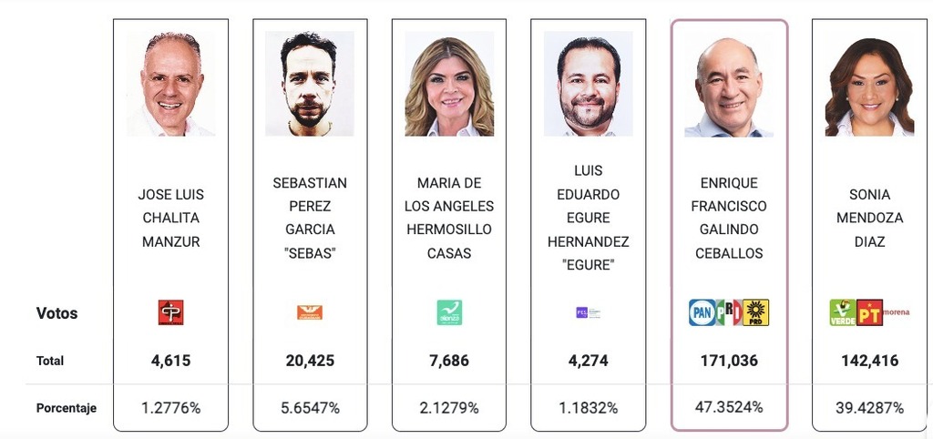 Además, los resultados del PREP permiten ver que Enrique Galindo logró la votación más alta para la presidencia municipal de la historia, pues con el 86.8 por ciento de las actas contabilizadas lleva más de 171 mil votos, con lo que supera el total de lo que obtuvo en 2021, cuando ganó la elecció a la alcaldía con 143 mil 630 votos.