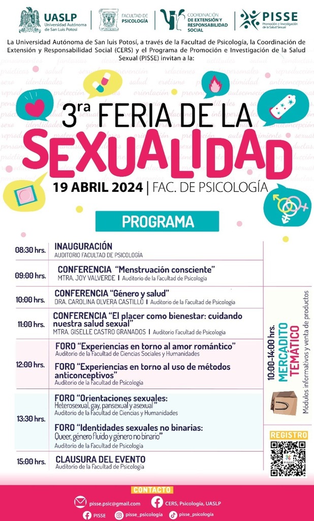 La Facultad de Psicología de la Universidad Autónoma de San Luis Potosí (UASLP), a través de la Coordinación de Extensión de Responsabilidad Social (CERS), del Programa de Prácticas Profesionales, así como de Promoción e Investigación Sexual (PISSE), llevará a cabo la 3ª. Feria de la Sexualidad, la cual tendrá lugar el próximo viernes 19 de abril de 2024 en un horario de 8:30 a 15:00 horas, en las instalaciones de la entidad académica.