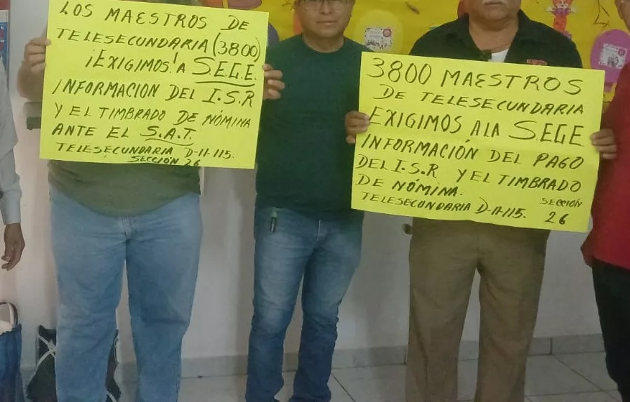 “Exigimos a la SEGE información del pago del ISR y el timbrado de nómina ante el SAT”, con esta consigna, maestros de telesecundaria se manifestaron a las afueras de las instalaciones de la Sección 26 del SNTE, en demanda de transparencia y aclaraciones sobre presuntas irregularidades en sus percepciones.