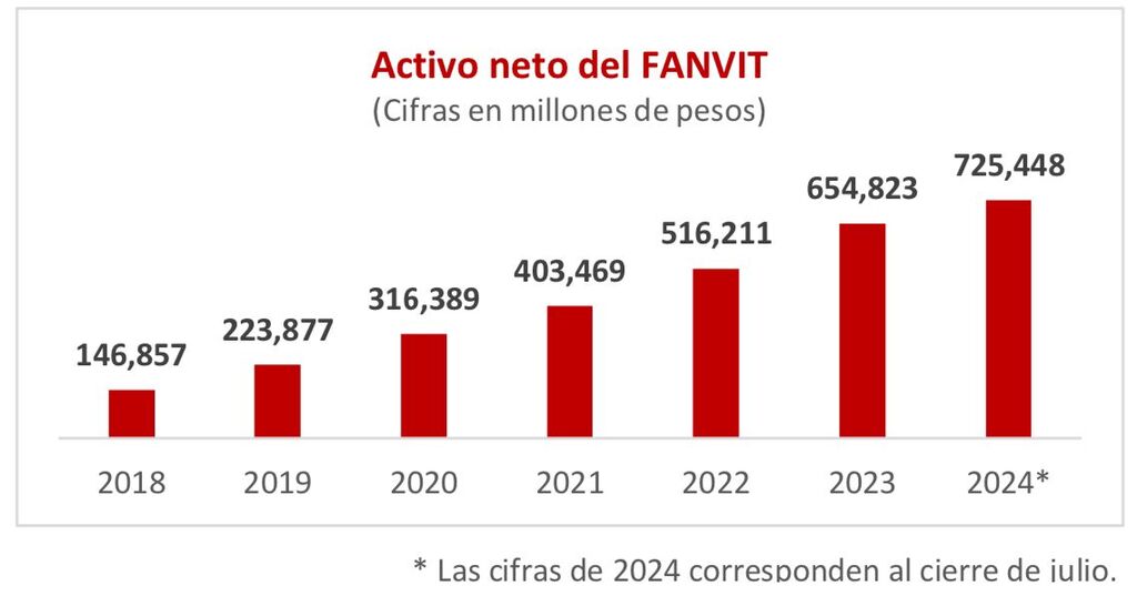El activo neto del FANVIT aumentó de 146 mil 857 millones de pesos, en diciembre de 2018, a 725 mil 448 millones de pesos al cierre de julio de 2024.