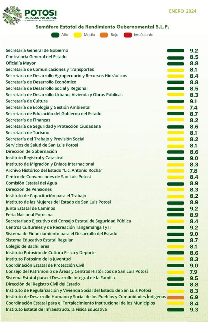 Asimismo, 22 dependencias se encuentran en color verde, con rendimiento alto, siendo el Sistema Estatal para el Desarrollo Integral de la Familia, que preside Ruth González Silva, esposa del gobernador Ricardo Gallardo Cardona, el área mejor evaluada.