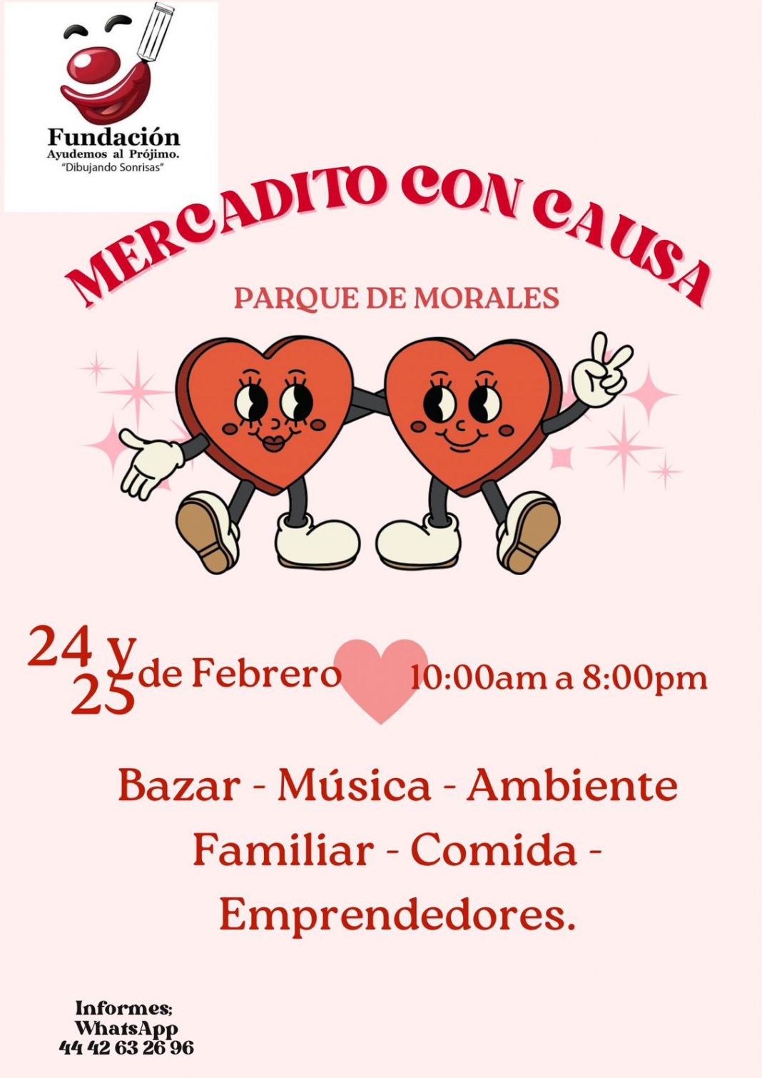El sábado 24 y domingo 25 de febrero se estará llevando a cabo el Mercadito con Causa que organiza la Fundación Ayudemos al Prójimo SLP, en el Parque de Morales, en un horario de 10:00 de la mañana a 8:00 de la noche, ambos días.