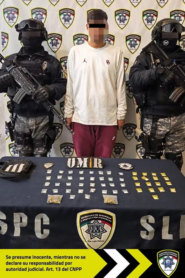 Al acercarse para verificar la situación, el individuo intentó huir y mostró una actitud agresiva y evasiva hacia los agentes. Tras ser asegurado, se le practicó una inspección preventiva y se le localizó una mochila negra colgada al cuello, en cuyo interior se encontraron 51 dosis de la droga conocida como “cristal” —34 envoltorios transparentes y 17 de color amarillo— con un peso aproximado de 34.4 gramos, así como dos bolsas con marihuana con un peso total de 10 gramos.