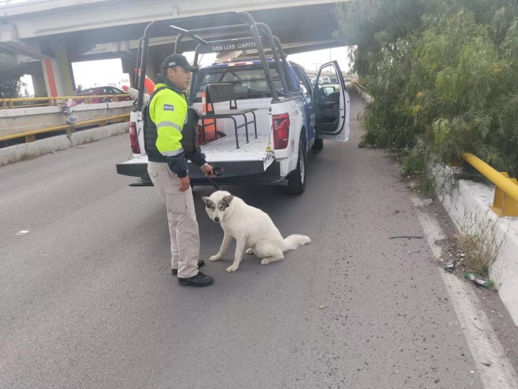 Gracias a la oportuna intervención de agentes de la Policía Vial, fue rescatado un perro macho de aproximadamente tres años que se encontraba en los carriles centrales del Distribuidor Juárez, lo que evitó un posible accidente y6 permitió ponerlo a salvo.