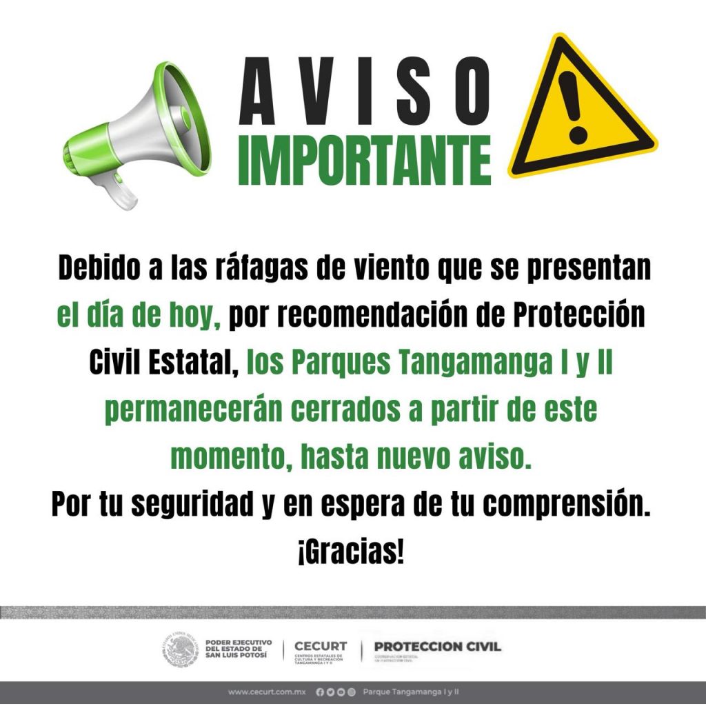 La Coordinación Estatal de Protección Civil (CEPC) anunció que los Centros Estatales de Cultura y Recreación Tangamanga (Cecurt), permanecerán cerrados, debido a las condiciones climáticas que prevalecen en la capital potosina, con rachas de viento de hasta 60 kilómetros por hora.