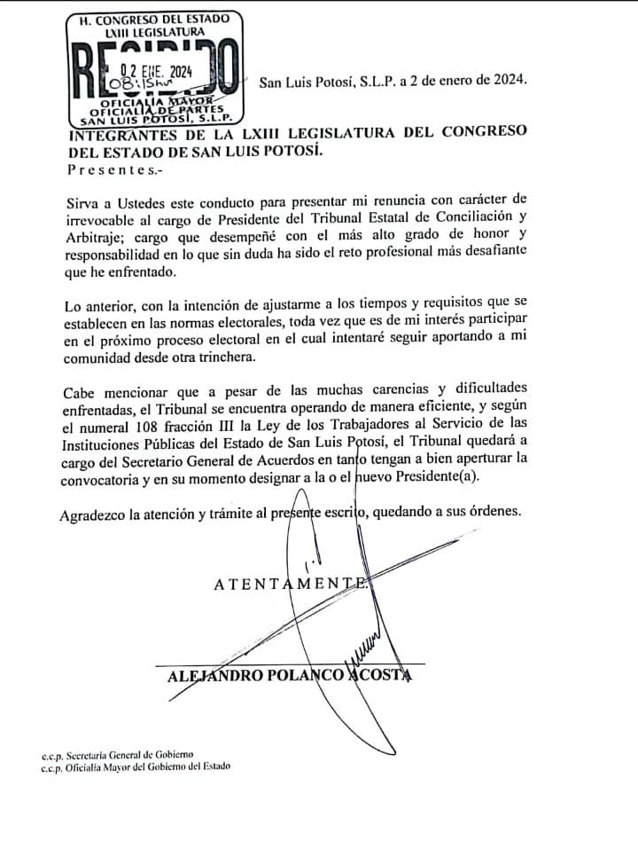 La mañana de este martes 2 de enero, Alejandro Polanco Acosta presentó su renuncia con carácter de irrevocable al Tribunal Estatal de Conciliación y Arbitraje (TECA)