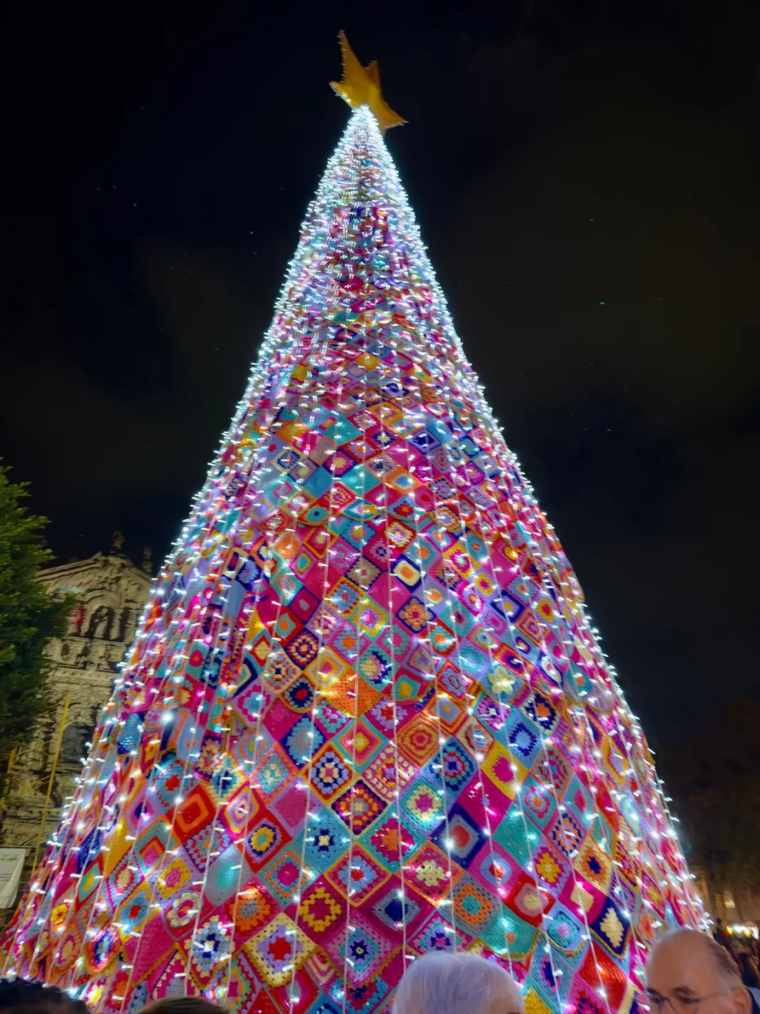 La Plaza del Carmen luce este año un árbol navideño de 10 metros de altura elaborado completamente a base de tejido, una obra colectiva creada con más de 3,200 cuadritos confeccionados por artesanas y artesanos de distintas partes del país.
